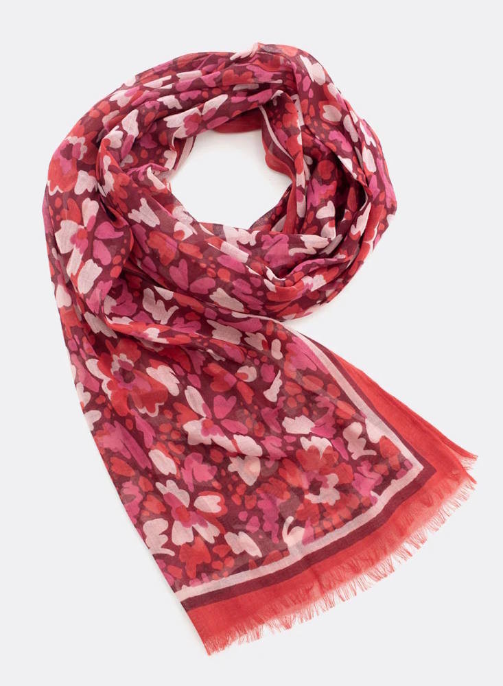 Foulard léger pour femme, réalisé dans un tissu fin aéré 100% coton biologique. Imprimé fleurs réalisé à la main, au pochoir. Petites franges aux extrémités. Tons rouges.