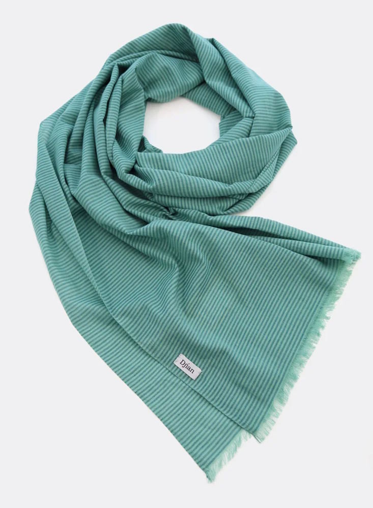 Foulard léger pour femme, avec de fines rayures tissées et une finition par petites franges. Il est réalisé dans un tissu fin de coton biologique. Tons verts.