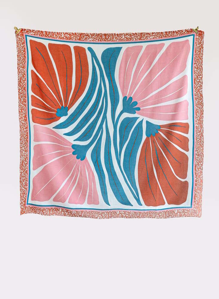 Grand foulard carré coloré, réalisé dans un tissu fin de coton biologique. L'imprimé représente de grandes fleurs. Parfait pour apporter une touche de couleur à vos tenues et garder votre cou au chaud.
