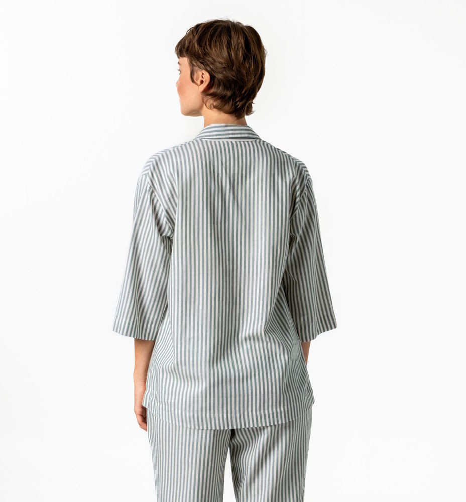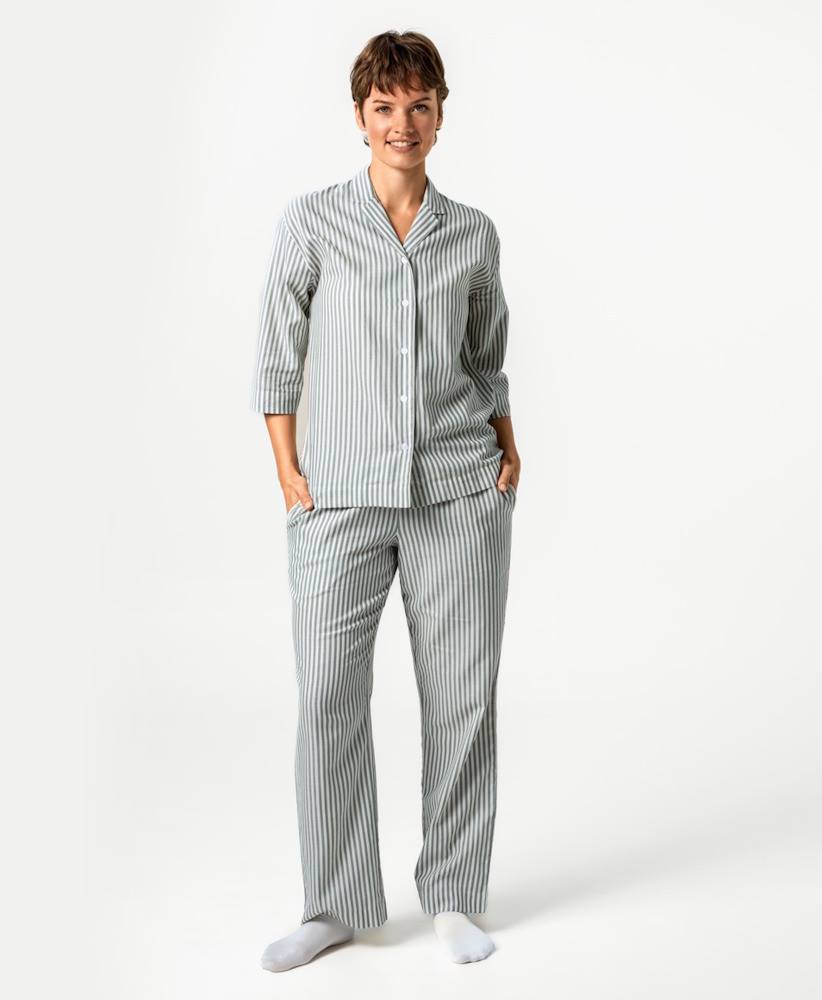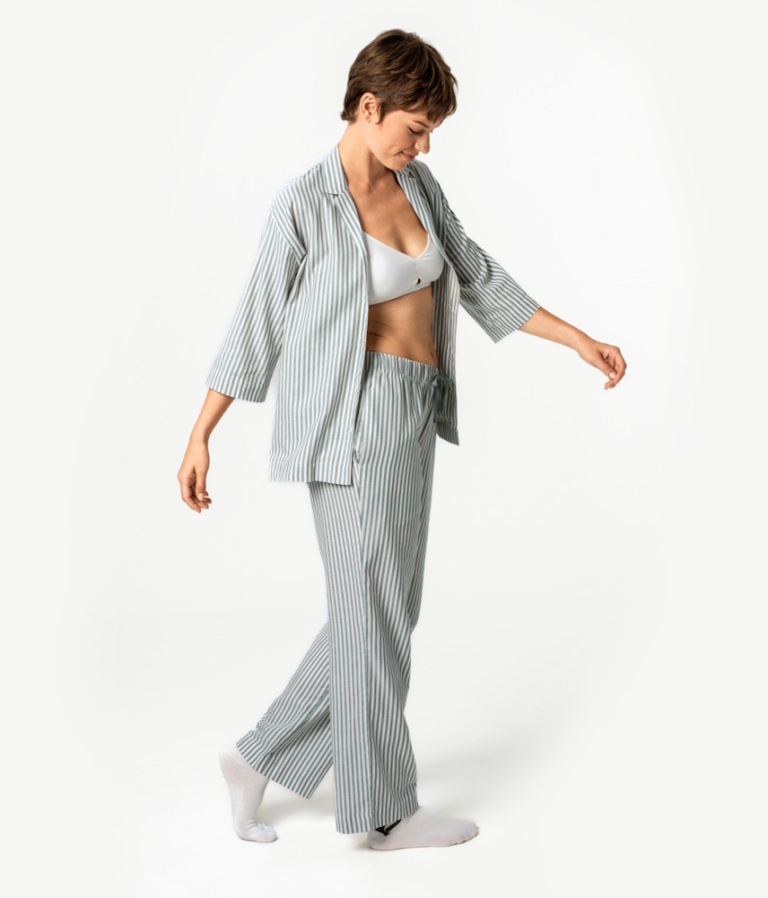 Modèle de pyjama chemise vegan. 2 poches dans le pantalon, et un cordon pour le resserrer à la taille.
