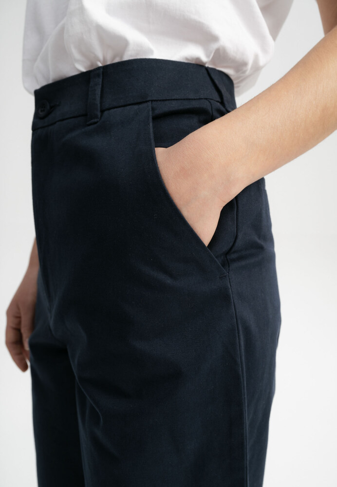 Ce pantalon classique bleu marine en pur coton bio pour femme fait partie de notre collection de vêtements sans matières synthétiques Melawear. Melawear s'inspire du concept "Cradle to Cradle", qui est un principe de conception basé sur la nature, qui ne produit pas de déchets. Les produits sont conçus non seulement de manière à ne pas nuire à l'environnement, mais aussi dans l'idée de pouvoir être réintégrés dans la nature comme nutriments. Melawear n'utilise pas de tissus à fibres mixtes. De plus la marque utilise du fil de coton pour les coutures, des étiquettes en coton, des boutons de noix biodégradables et des entoilages en coton.