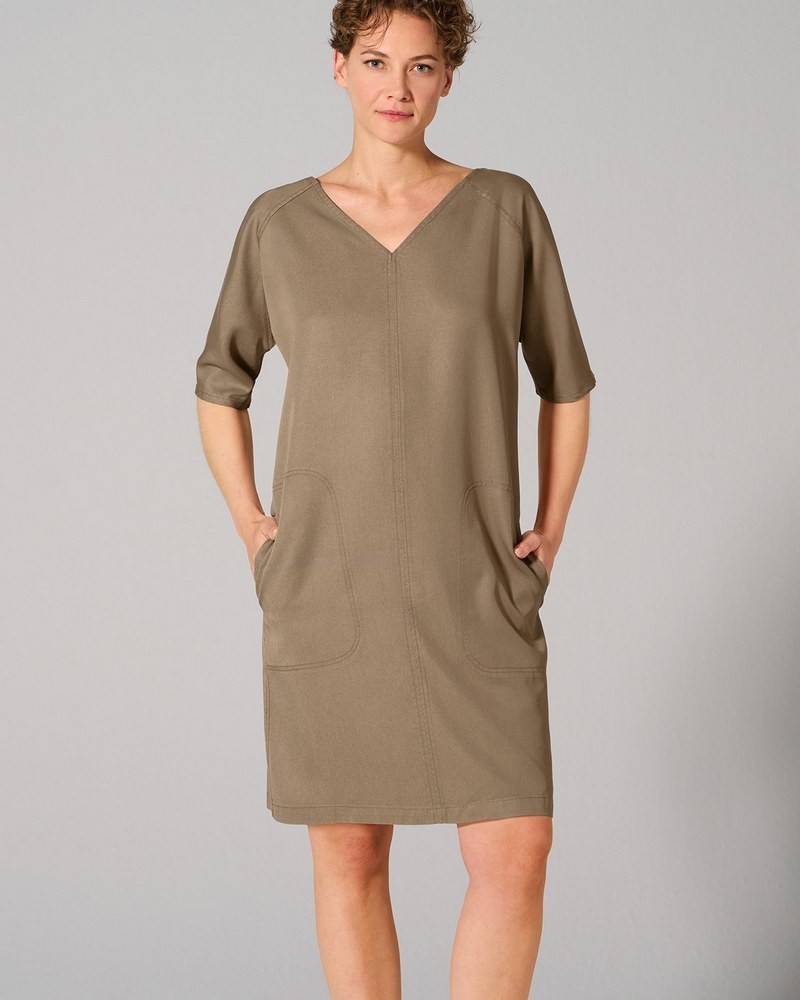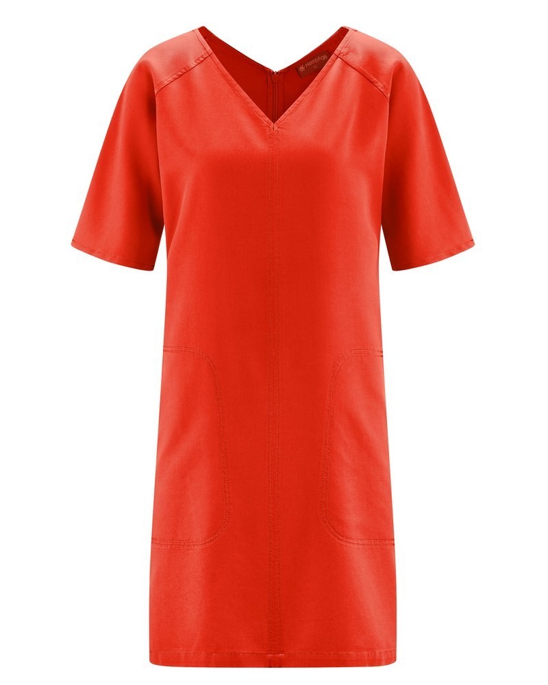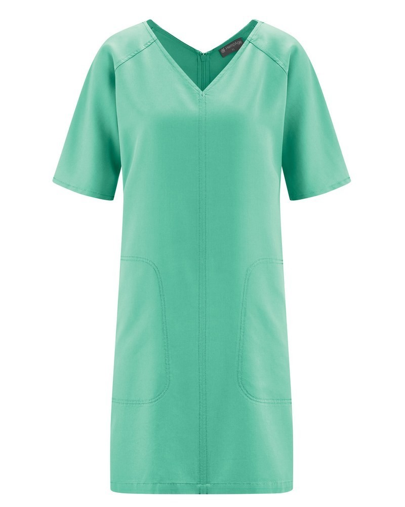 Modèle : robe d'été manches courtes en tissu écologique fluide et légèrement brillant. Modèle droit, avec 2 poches, une fermeture éclair dans le dos et des manches raglan.