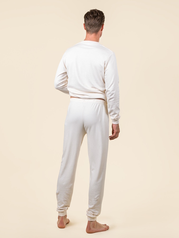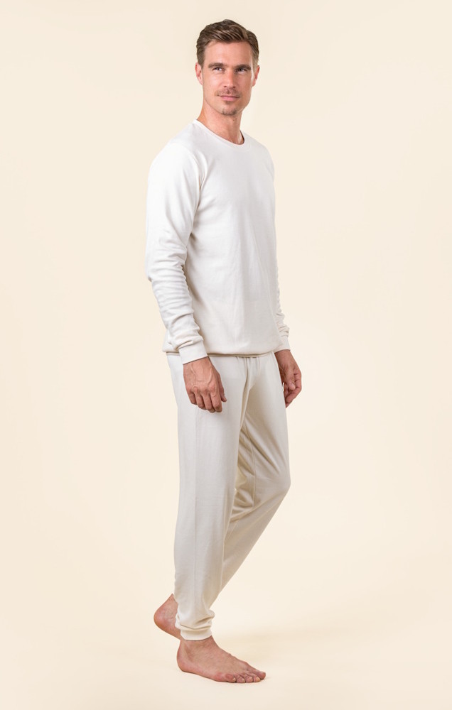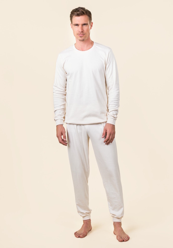 Modèle : Pyjama hiver homme en coton bio. Haut col rond et bas avec un élastique à la taille. Finition bords côtes.