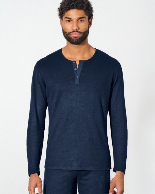 Modèle : t-shirt vegan pour Homme. Manches longues, patte de boutonnage. Aisance normale.