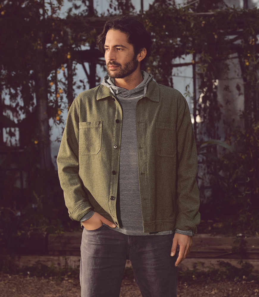 MODÈLE : Veste courte et légère pour homme, de coupe droite. Boutons végétaux. Modèle vegan.